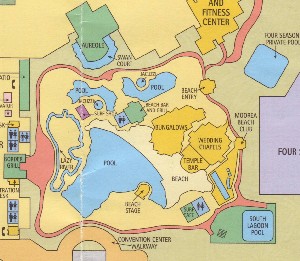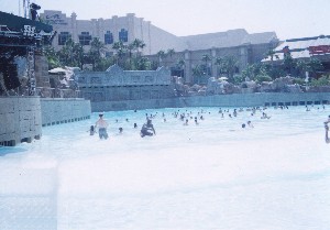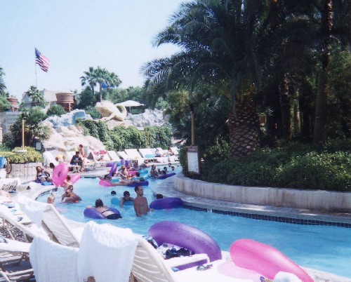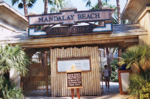 | 時間は13時。 そろそろプールも人が多くなってきそうな時間である。 所持品はサングラスと使い捨てカメラとルームキー、現金20ドル。 マンダレイベイのプールはカジノフロアのひとつ下の階から直結しているため カジノを通る必要は無かったです。 標識があるので、それに従っていけば入り口に到着。